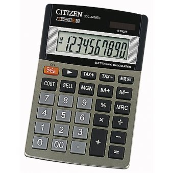 Kuvassa näkyy etupuoli view of the Citizen SDC 8430te calculator, highlighting its display and keypad.