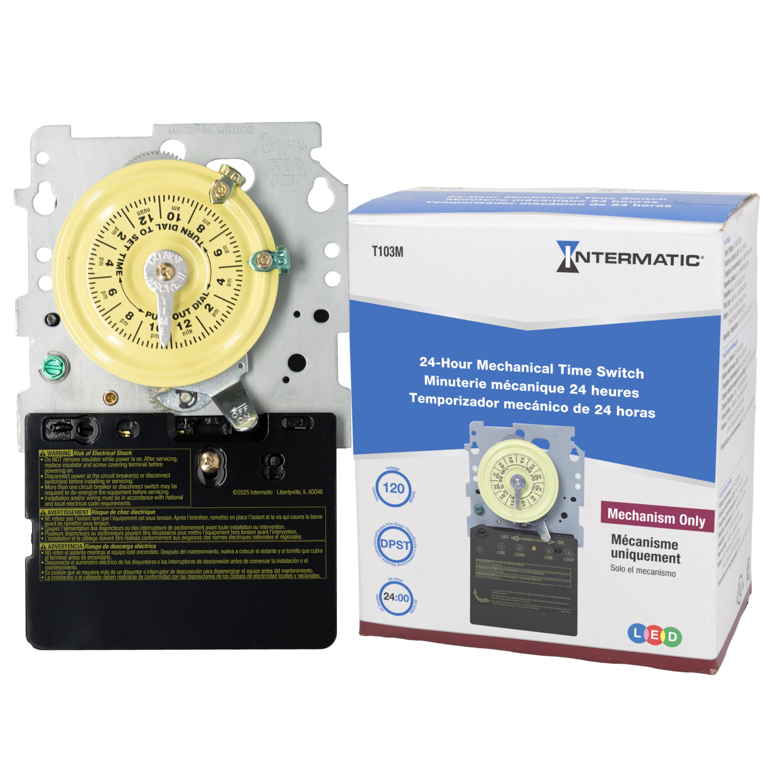 The Intermatic T103M Dial Timer Mechanism is a robust 24-hour mechanical timer designed for various applications including indoor/outdoor lighting, signs, filters, electric fences, fans, conveyors, pool heaters, blowers, and pumps. This mechanism provides reliable scheduling with up to 12 ON/OFF operations daily, each with a minimum ON/OFF time of one hour. It features a DPST switch with a 40 Amp, 125 VAC, 2 HP rating.
