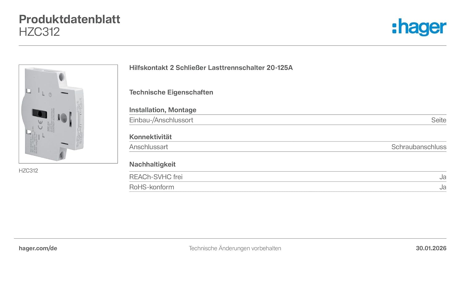For warranty information, technical support, or service inquiries regarding the Hager HZC312 Auxiliary Contact, please refer to the official Hager website or contact your local Hager distributor.