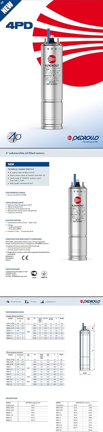 This manual provides essential information for the safe and efficient installation, operation, and maintenance of your Pedrollo 4-inch Submersible Borehole Rewindable Oil Motor, model 4PDm/0,75. Please read these instructions carefully before installation and use to ensure proper functioning and to prevent damage or injury. Keep this manual for future reference.