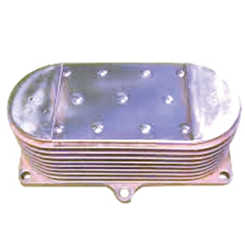 Image: All States Engine Oil Cooler, Model 123952. This image displays the compact unit with its multiple cooling plates and integrated mounting points. The package includes necessary gaskets and O-rings for a complete installation.