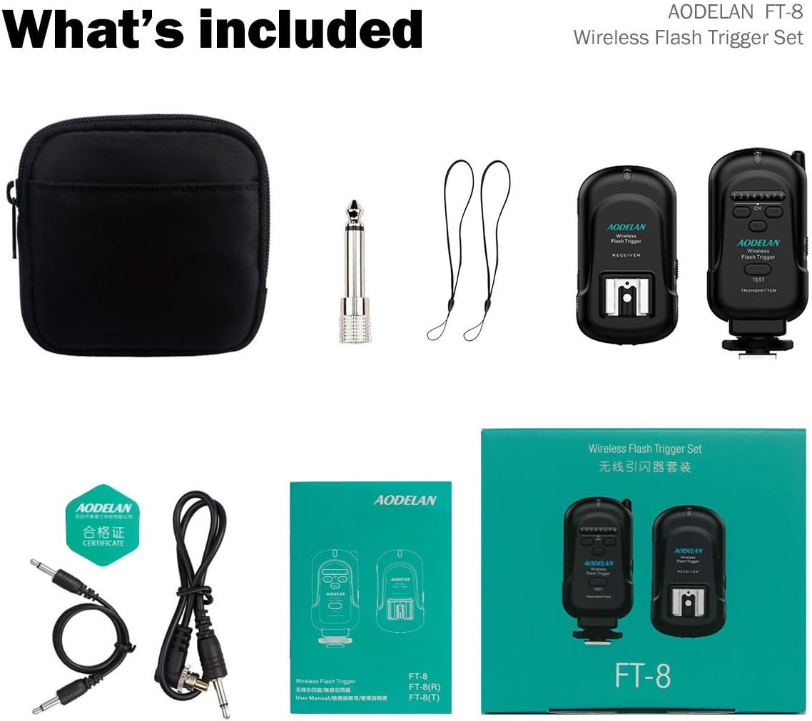 The AODELAN FT-8 Wireless Flash Trigger system allows for remote triggering of off-camera flash units and studio lights. Operating on a 2.4 GHz frequency, it provides a communication range of up to 200 meters (656 feet) without requiring line-of-sight. This system features 8 channels, enabling control of individual or multiple flash units simultaneously. It is compatible with most cameras equipped with a standard hot shoe mount and flashes with a 3.5mm port, including Canon, Nikon, Sony (metal hot shoe), Olympus, Panasonic, Pentax, Fuji, and Samsung cameras. The transmitter offers a 90-degree rotating adjustment for flexible positioning.