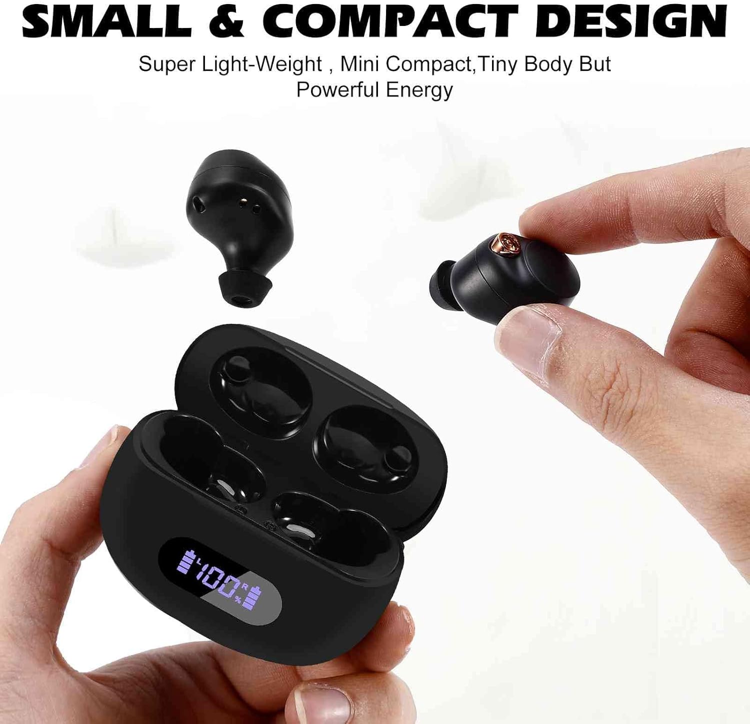 Image: Small and Compact Design of UrbanX Earbuds. This image illustrates the small size of the earbuds, with one being held between fingers, emphasizing their lightweight and mini compact form factor.