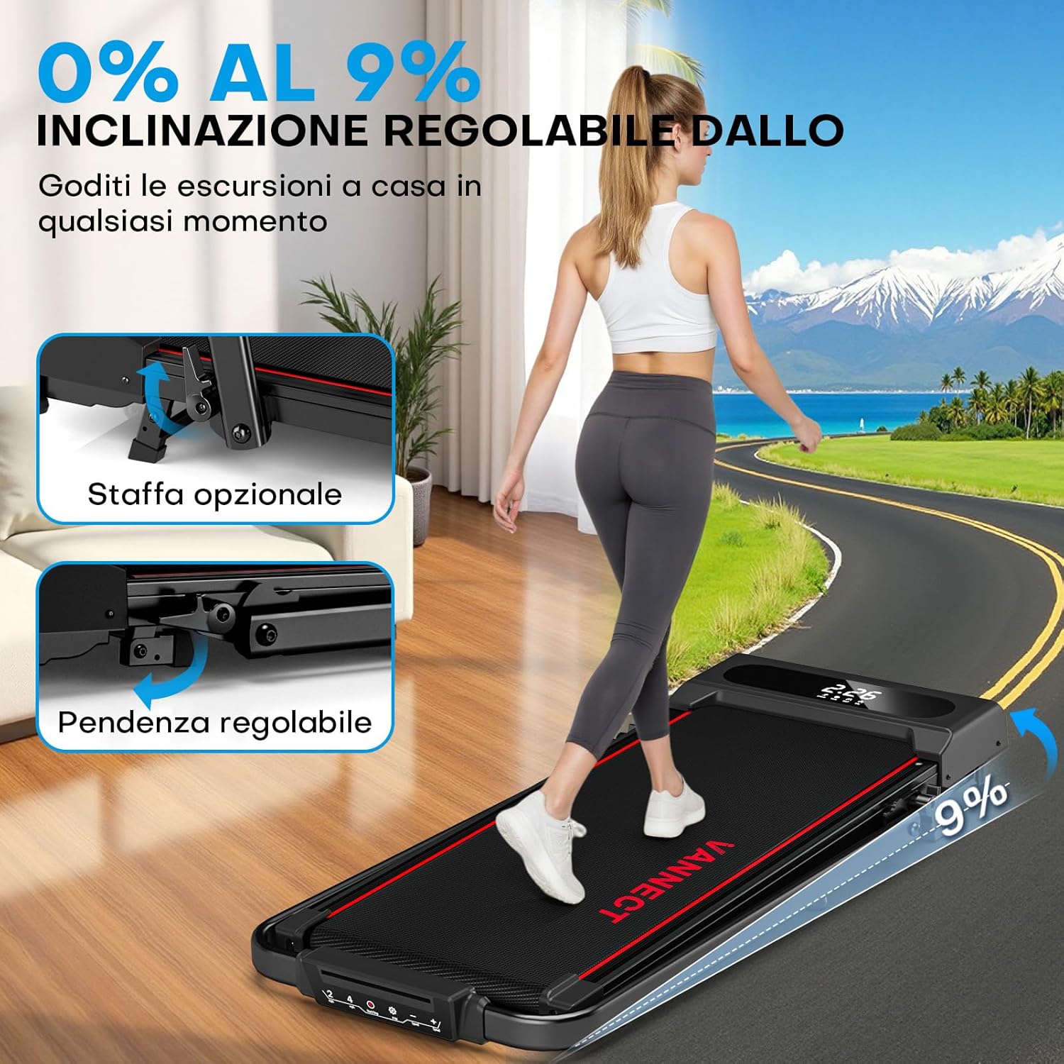 - Säädettävä kaltevuus: Manual 9% incline adjustment to simulate uphill walking/running, enhancing calorie burn.